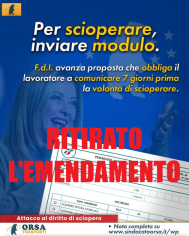 Infatti, dopo l'emendamento di FdI al Decreto ILVA, ritirato a seguito delle nostre denunce, tendente a rintrodurre la prescrizione quinquennale dei crediti da lavoro anche durante il rapporto di lavoro è ora il momento di attaccare il diritto di sciopero.