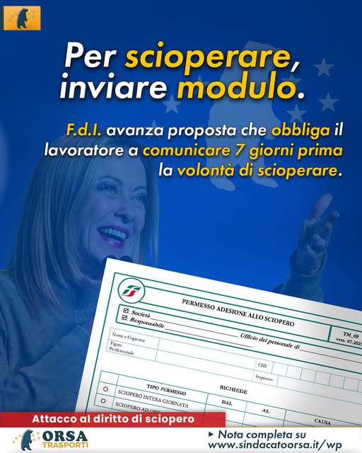 Un emendamento dei FdI presentato alla legge di bilancio prevederebbe l'obbligo per i lavoratori di comunicare in modo irrevocabile la propria adesione allo sciopero nei servizi pubblici.