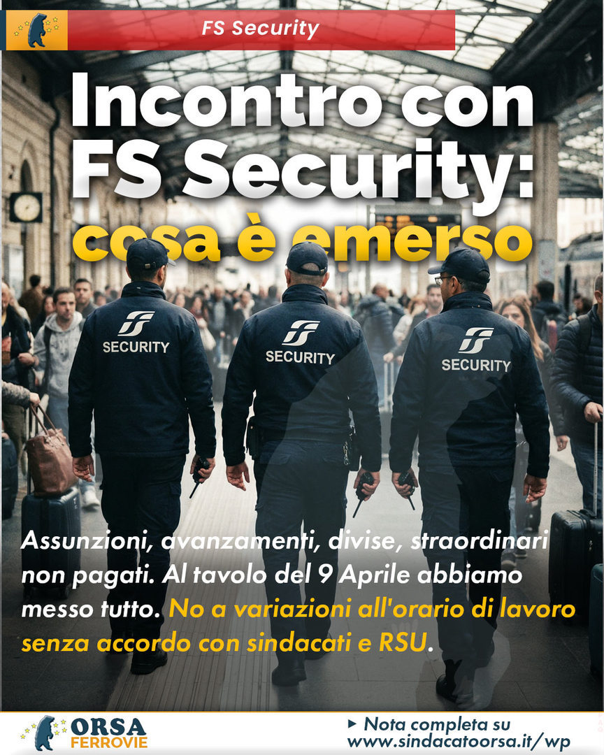 Nella giornata di ieri, 9 aprile, si è tenuto l'incontro con la dirigenza di FS Security, in merito all'applicazione dell'accordo nazionale dell'aprile 2024, inoltre abbiamo denunciando le criticità relativa ad assunzioni, divise, straordinari non pagati.