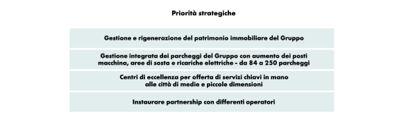 A ciò si aggiungono la gestione integrata dei parcheggi del Gruppo che passeranno da 84 a 250, arrivando così a gestire 20.000 posti auto in più con una crescente presenza di punti di ricarica elettrica; lo sviluppo di centri di eccellenza per offrire servizi chiavi in mano, a città di medie e piccole dimensioni - quelle che hanno tra i 100.000 e i 400.000 abitanti - per progettare, realizzare, finanziare e gestire infrastrutture per la mobilità sostenibile urbana; l'avvio di partnership con differenti operatori per la realizzazione e la gestione degli asset.