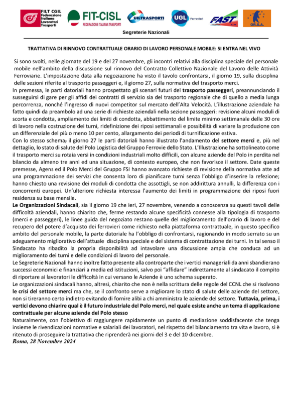 Nella giornata del 24 Aprile si è svolto il previsto incontro in Agens relativo al tavolo negoziale per il rinnovo del CCNL della Mobilità/Area Contrattuale Attività Ferroviarie.