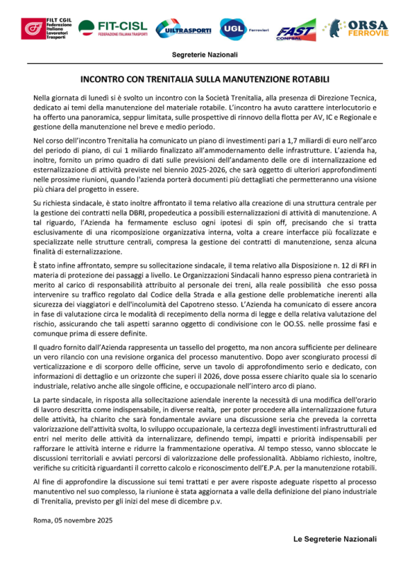 Comunicato unitario Trenitalia Manutenzi[...]