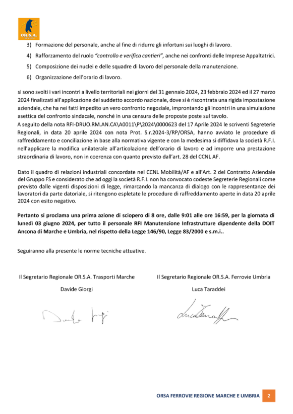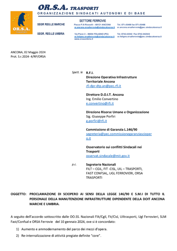 02.05.2024 - Dichiarazione di Sciopero RFI